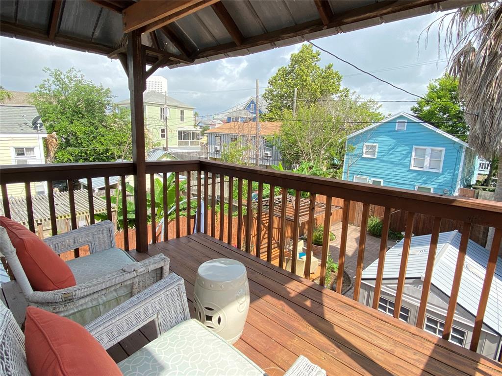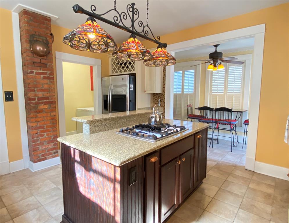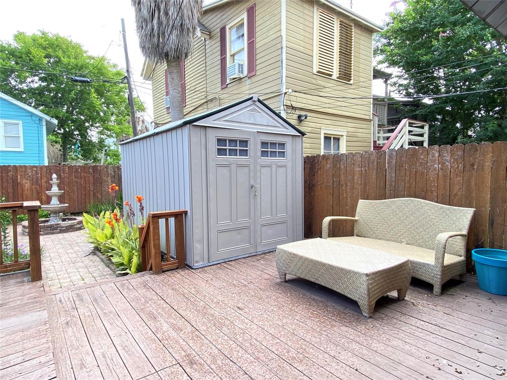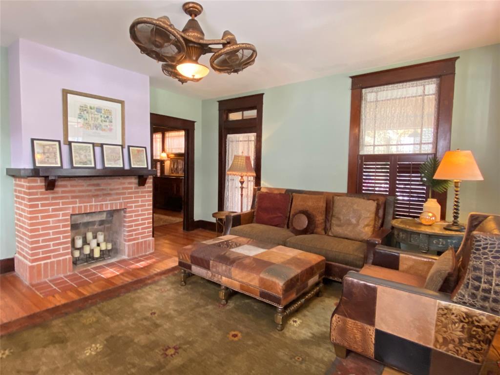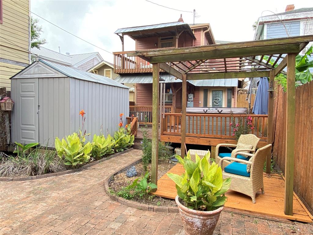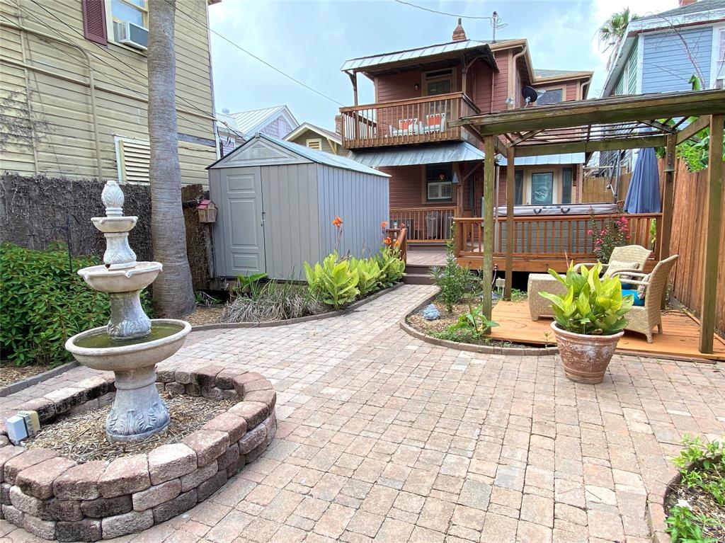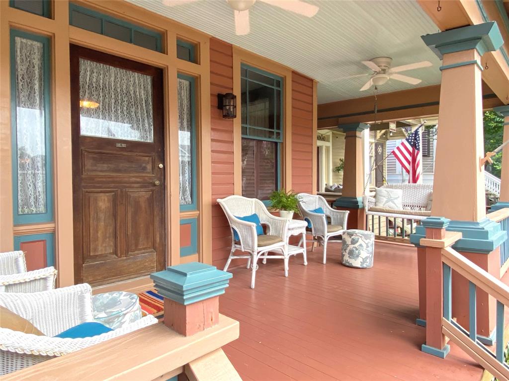 Beautifully restored and fully landscaped 1907 Arts & Crafts home w/fireplace and wrap around porchin EEHD. The updated kitchen includes copper sink, convection oven, large utility room and breakfast nook that leads to a back deck, hot tub and fountain in the backyard, a great fully fenced entertaining space! Wood floors throughout home with tile in kitchen and breakfast nook. There is a designer 3/4 bath downstairs. Plenty of windows add to the sunny appeal and charm of this beauty additionally storage space is plentiful, a rarity in these homes! Upstairs are 3 bedrooms, the primary has a walkout deck and full bath. Just steps away from Mosquito Cafe and 14th St. corridor of restaurants. Convenient to UTMB and downtown. Back porch buildout has added 84 sf to the home. Outdoor back space begs for alfresco dining while the charming front wraparound porch with a swing is great for a spontaneous get together for enjoying the soothing Gulf Breezes! Room for parking in back if desired.