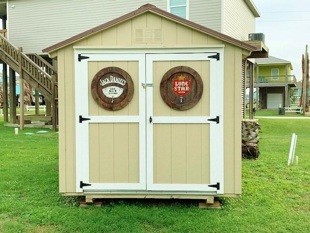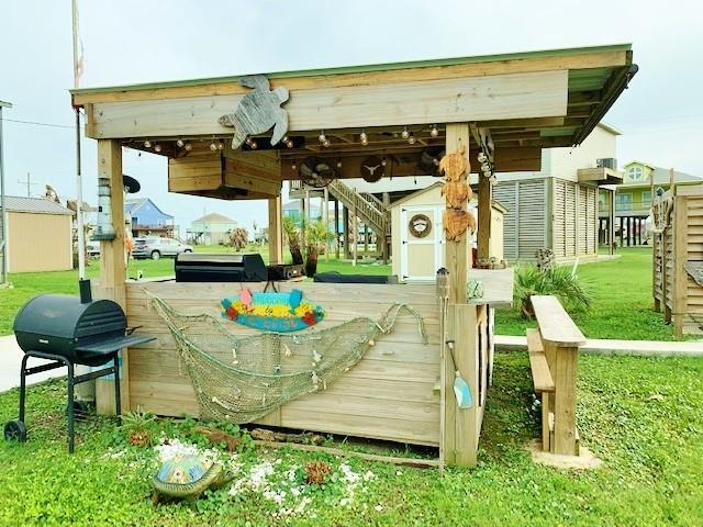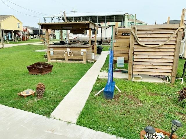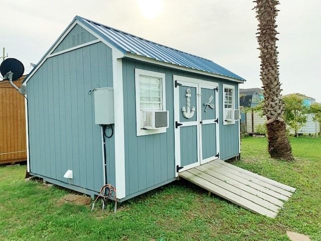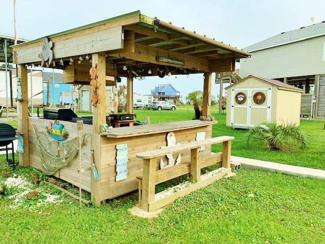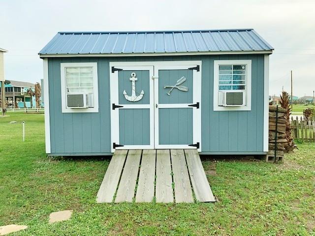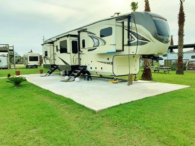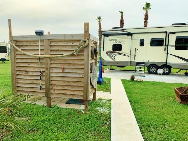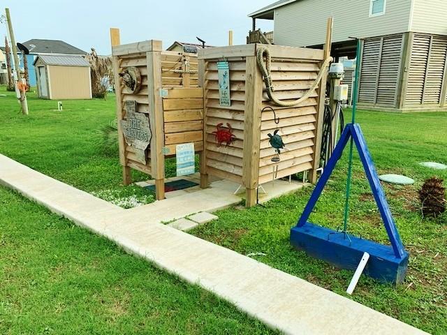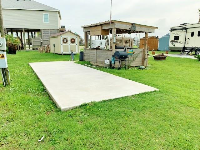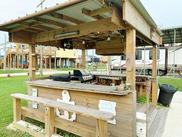 Awesome beachside get-a-way! 2 lots, two concrete RV pads (20 x 45 & 10 x 20), tiki bar with electric, 2 storage buildings with electric, sidewalks, sand shower, aerobic system both rv pads tie into! The blue shop has sleeper sofa, two a/c window units, fully insulated and a tankless water heater for the shop and outdoor sand shower! This won't last long! Your piece of paradise without the huge investment!