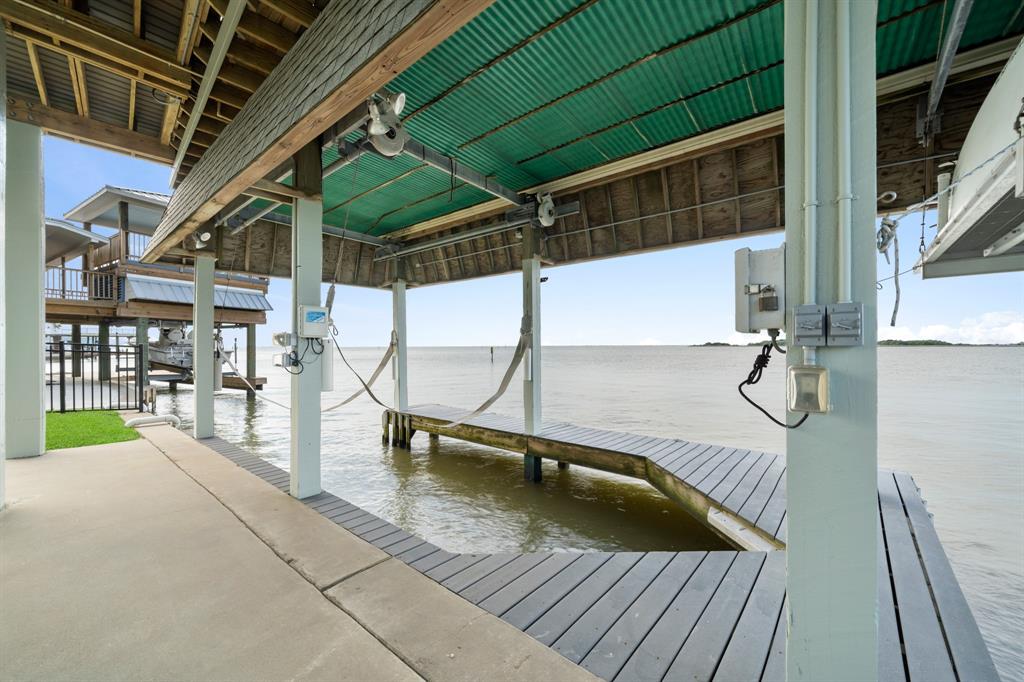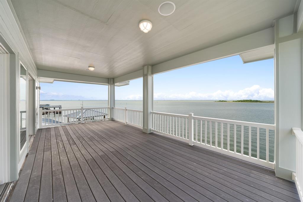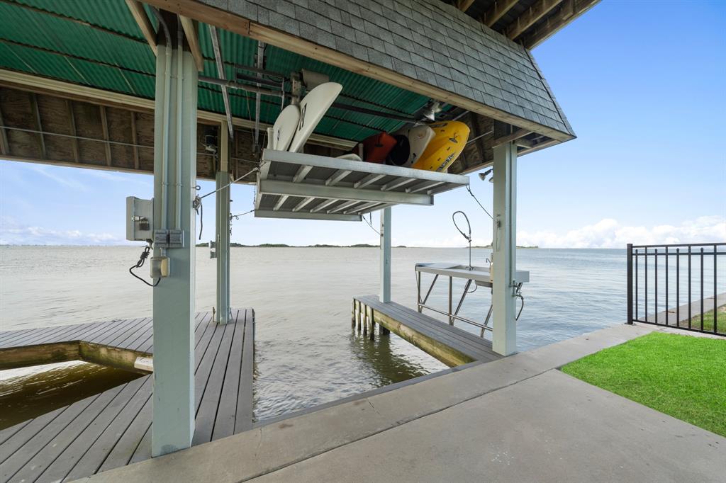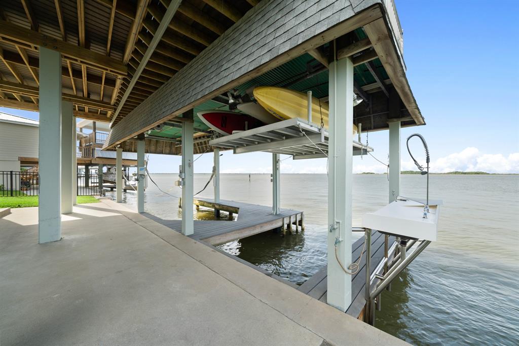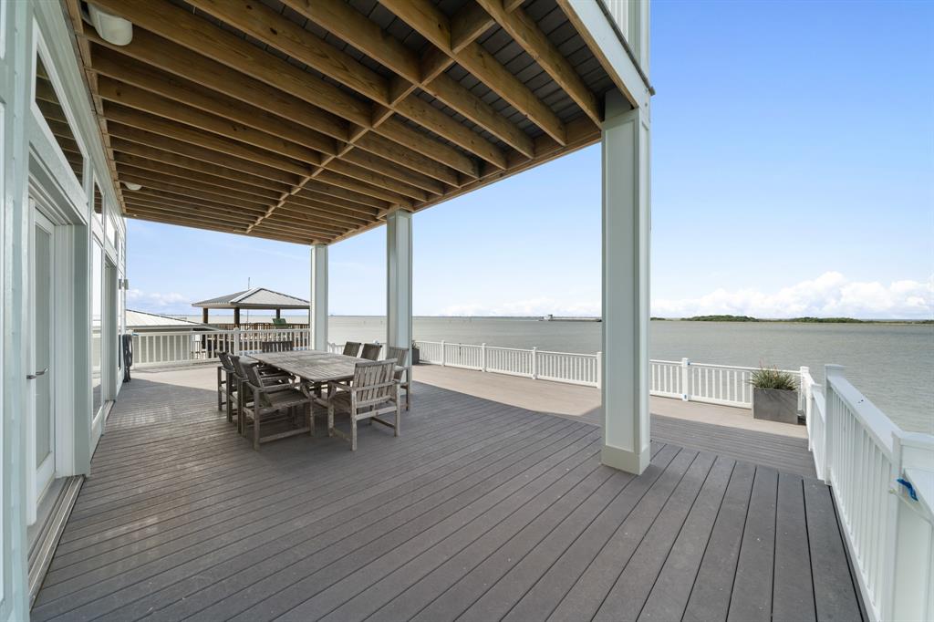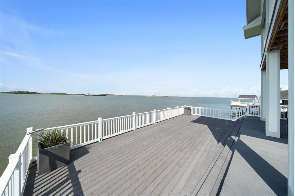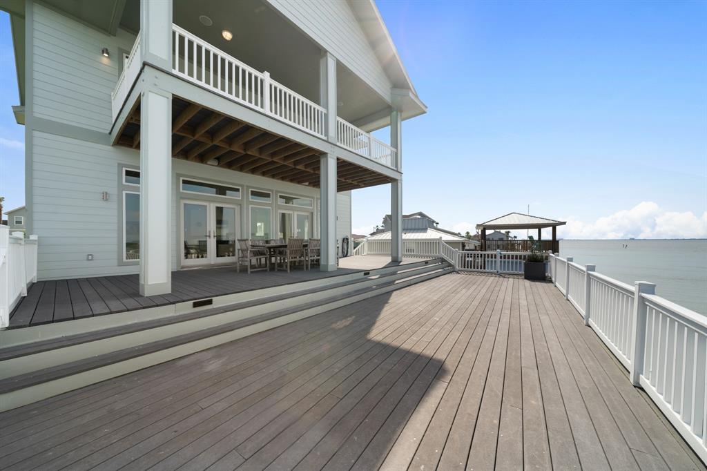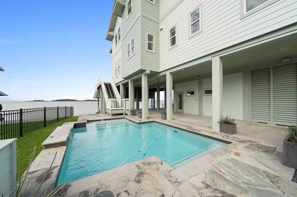 Meticulously maintained home located on Galveston Bay with unobstructed views of the bay and Deer Island from the living, dining, kitchen, and master bedroom with a huge partially covered Trex dining and lounging deck off the living room, and fully covered porch off master bedroom. The home features high end finishes and appliances with a clean modern look. The master suite is open and large with a study area, lots of windows, walk in closet, and nicely appointed bath with large glassed shower. The home has speakers in almost every room controlled by SONOS and a Mesh WiFi system. Kitchen features Miele steamer and dishwasher, Sub Zero refrigerator and wine cooler, soft close Brookhaven cabinets and drawers, pot filler, and two sinks. Outside there is a saline pool with water feature, boat dock, fish cleaning station, accessory lift, bathroom, and shower. Enjoy some of the best fishing in Tiki right from the dock! The home is sold beautifully furnished with a few exclusions.