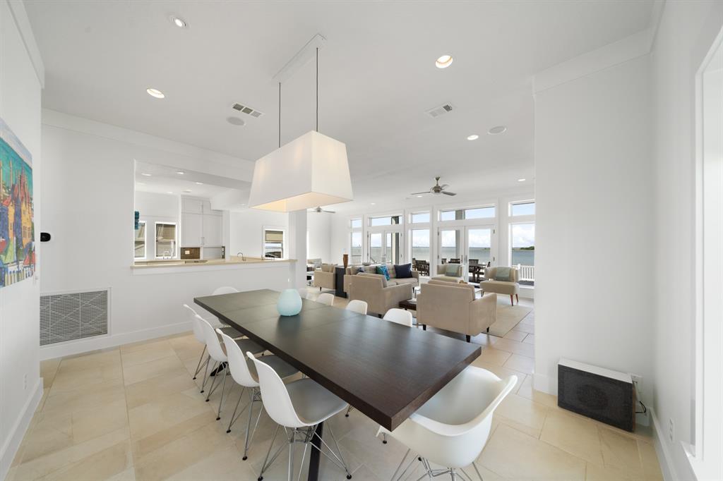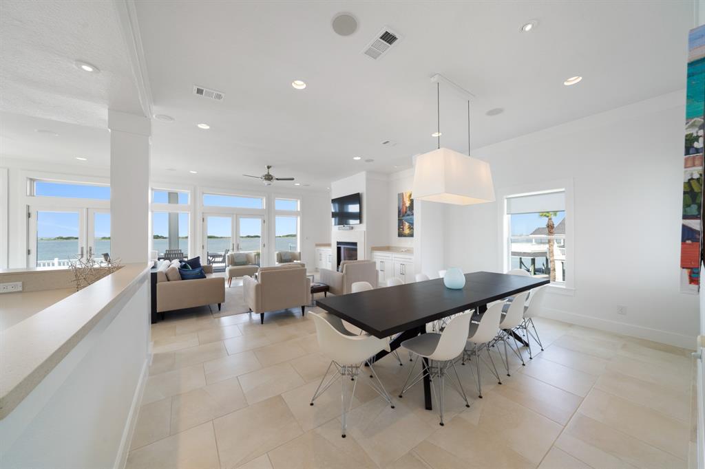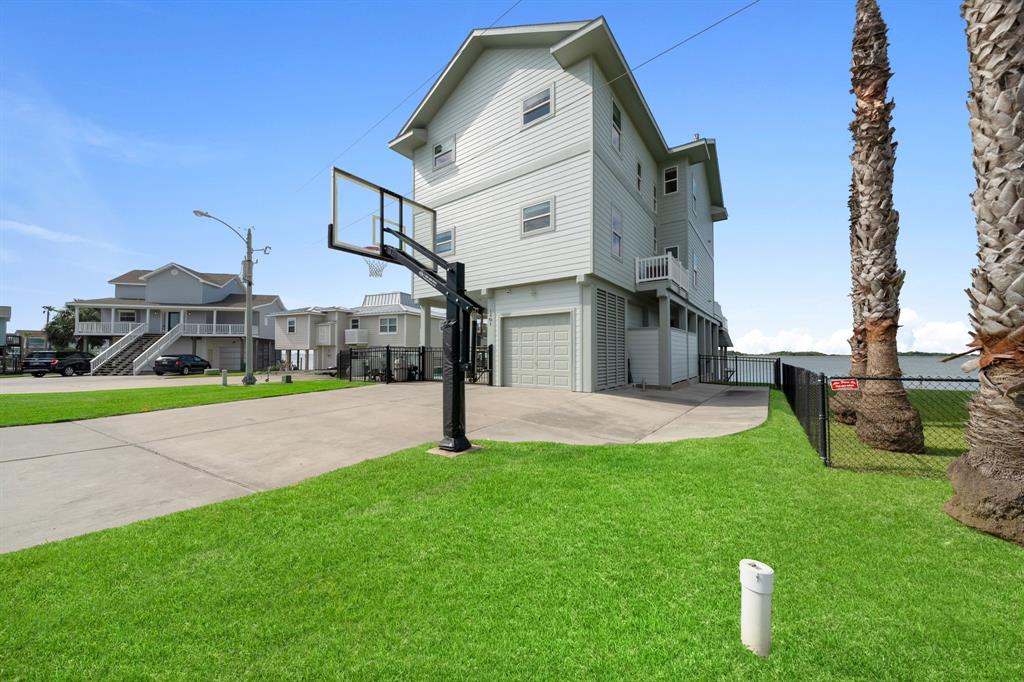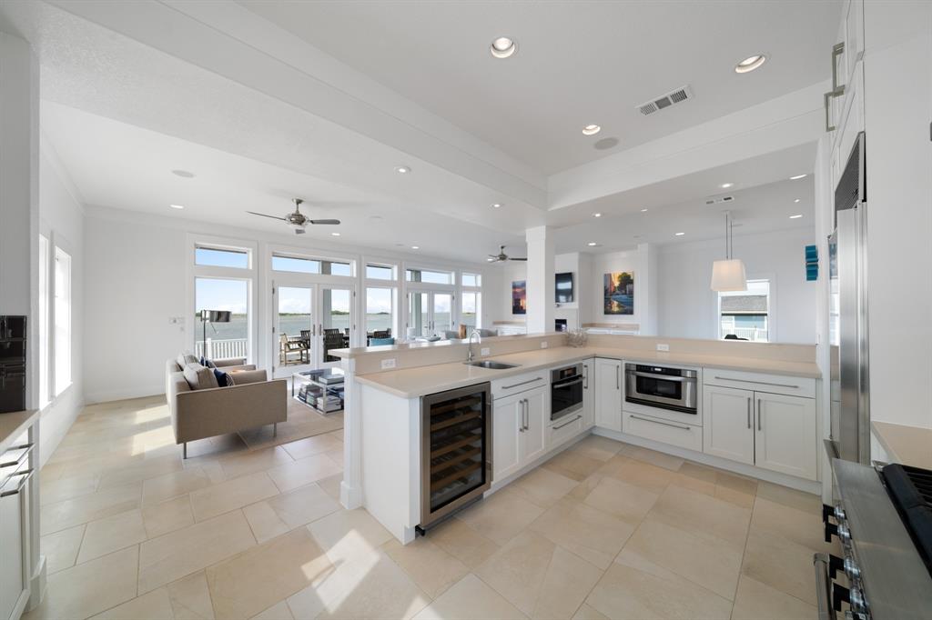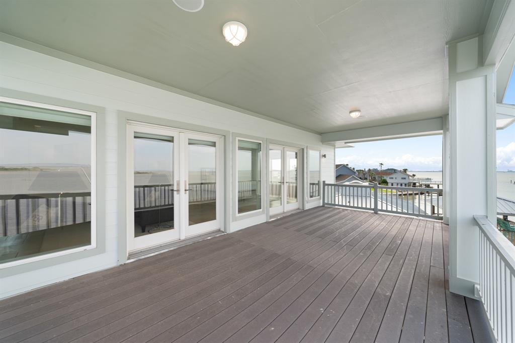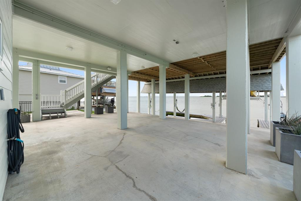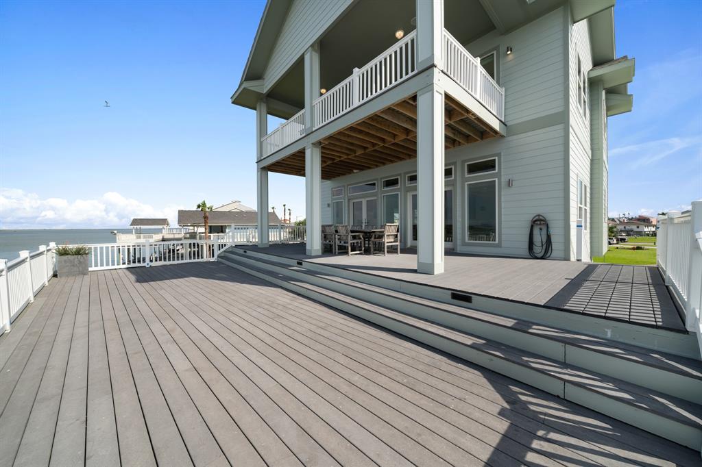 Meticulously maintained home located on Galveston Bay with unobstructed views of the bay and Deer Island from the living, dining, kitchen, and master bedroom with a huge partially covered Trex dining and lounging deck off the living room, and fully covered porch off master bedroom. The home features high end finishes and appliances with a clean modern look. The master suite is open and large with a study area, lots of windows, walk in closet, and nicely appointed bath with large glassed shower. The home has speakers in almost every room controlled by SONOS and a Mesh WiFi system. Kitchen features Miele steamer and dishwasher, Sub Zero refrigerator and wine cooler, soft close Brookhaven cabinets and drawers, pot filler, and two sinks. Outside there is a saline pool with water feature, boat dock, fish cleaning station, accessory lift, bathroom, and shower. Enjoy some of the best fishing in Tiki right from the dock! The home is sold beautifully furnished with a few exclusions.