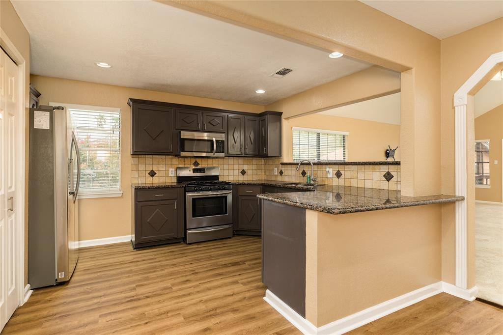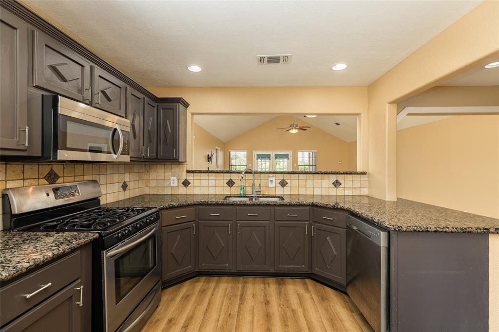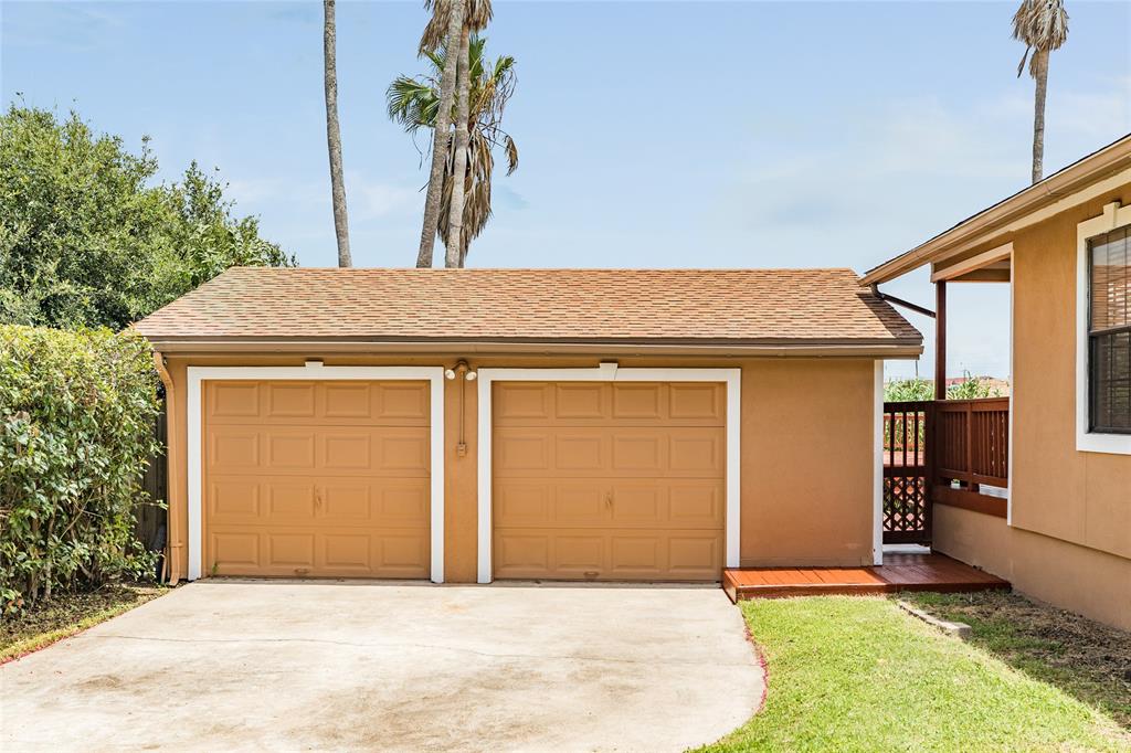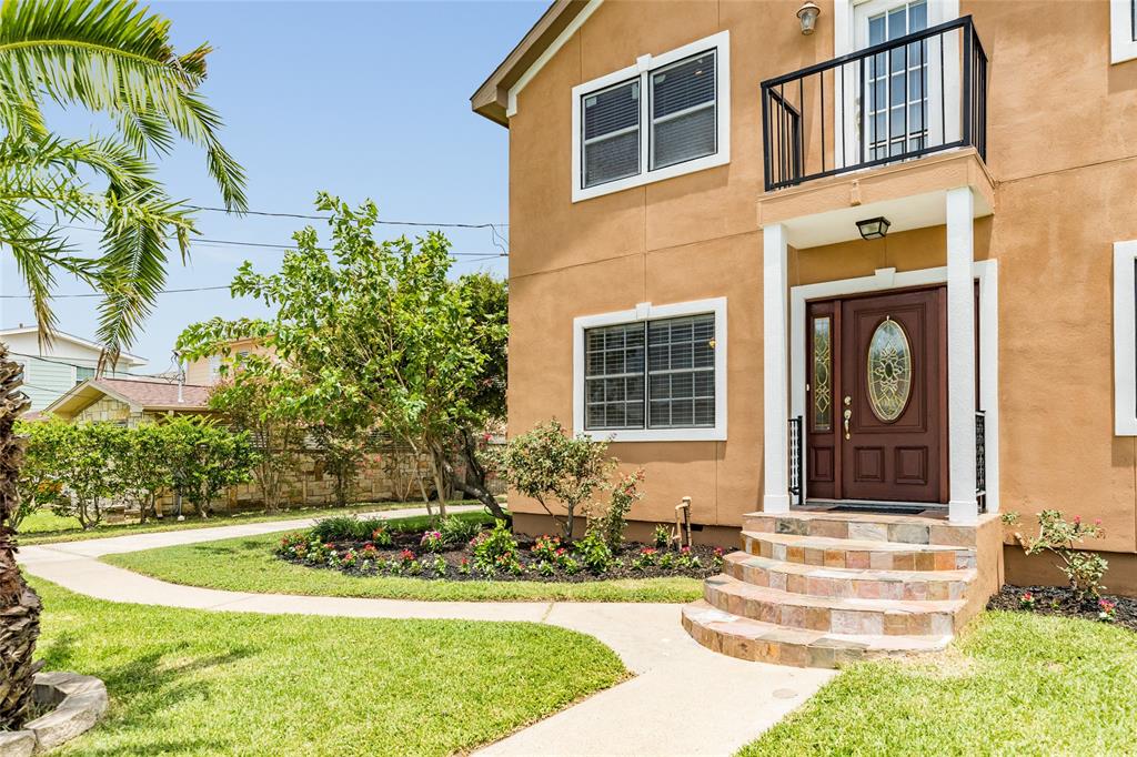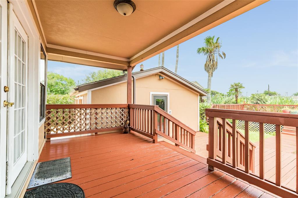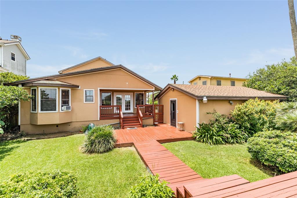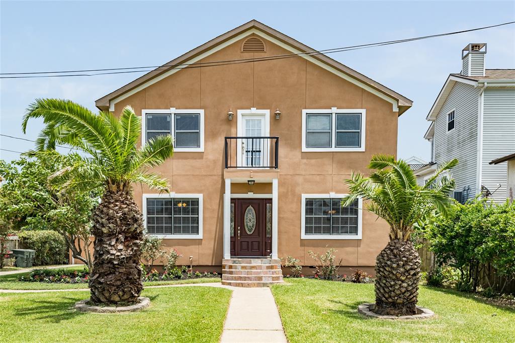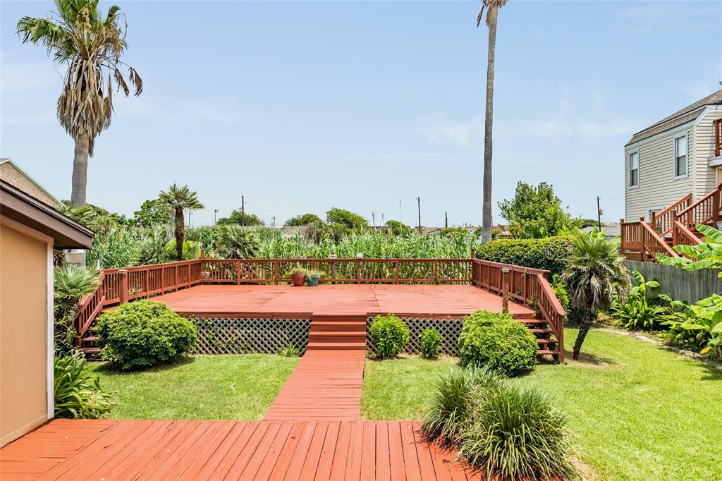 Spacious 4-bedroom home just a few blocks from the BEACH! This well-cared for home has 2 bedrooms on the first floor, including the primary bedroom, and 2 bedrooms plus a large living area upstairs. The updated kitchen opens to the large living room and has granite counter tops & stainless steel appliances including a 5-burner gas stove. Expansive living room with vaulted ceiling has French doors which open up to a patio and enormous fully-fenced back yard with mature tropical landscaping. Two zoned HVAC condensers installed in 2020. No power loss during the February 2021 freeze. Large deck in the backyard is perfect for grilling and entertaining. A detached 2-car garage also has attic storage space. This centrally located home is close to the beach, shopping, restaurants, Moody Gardens and Schlitterbahn Water Park.