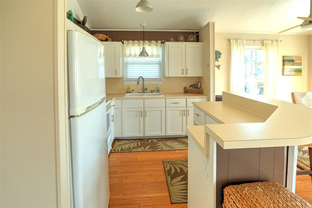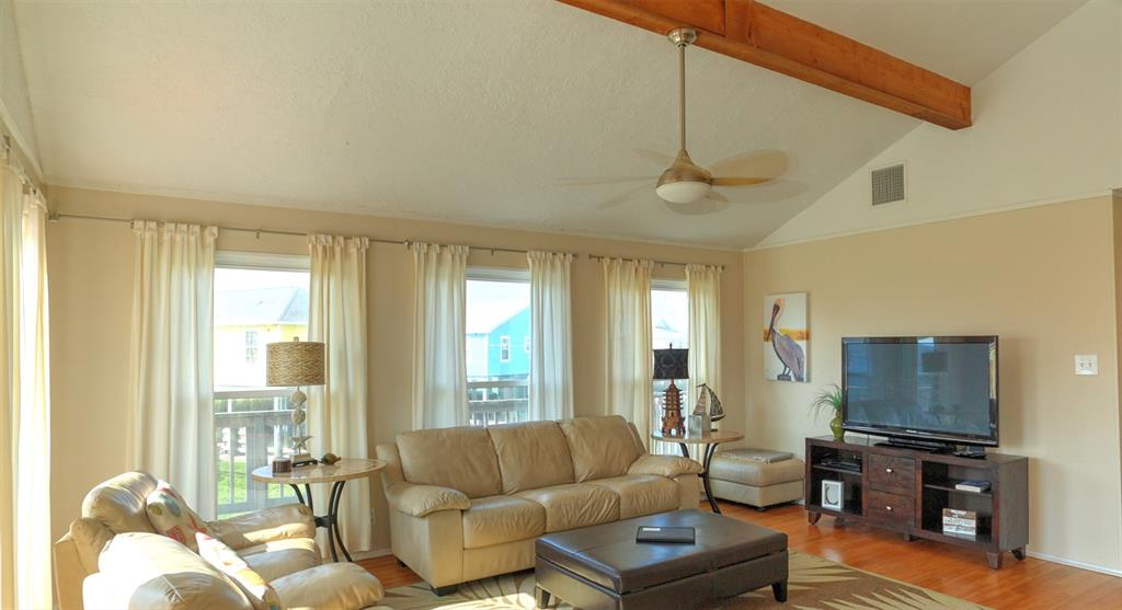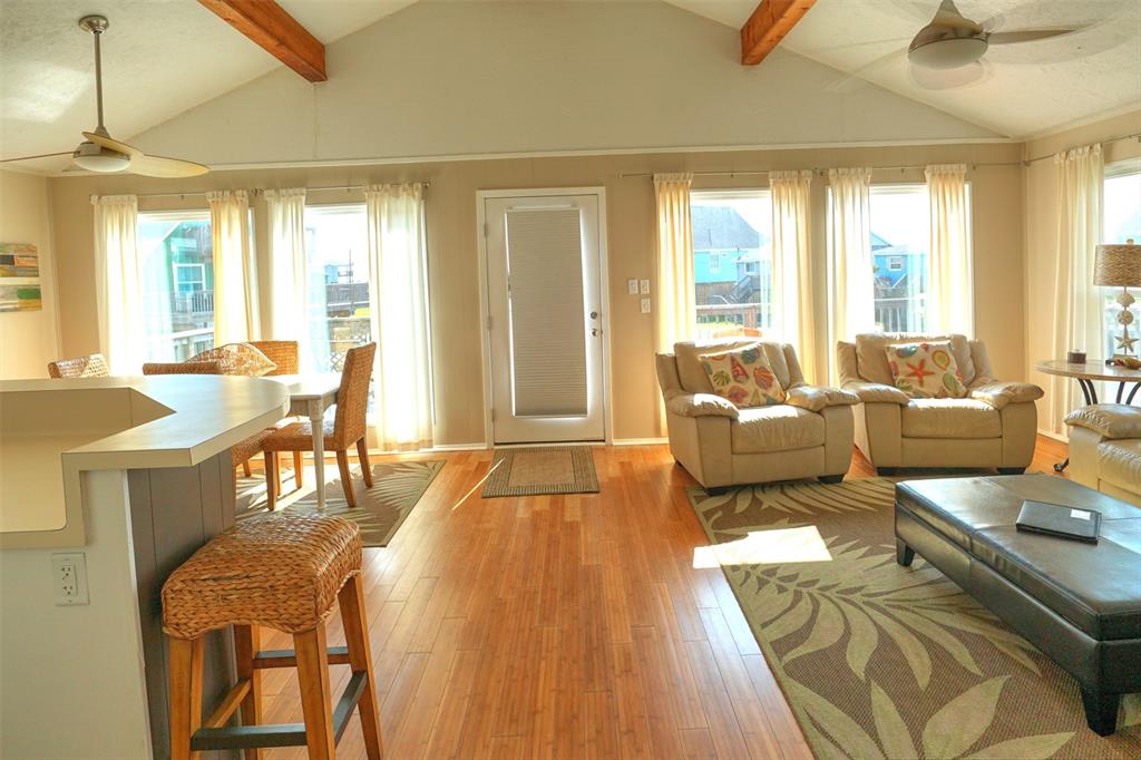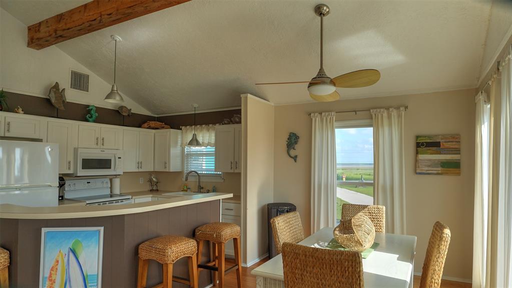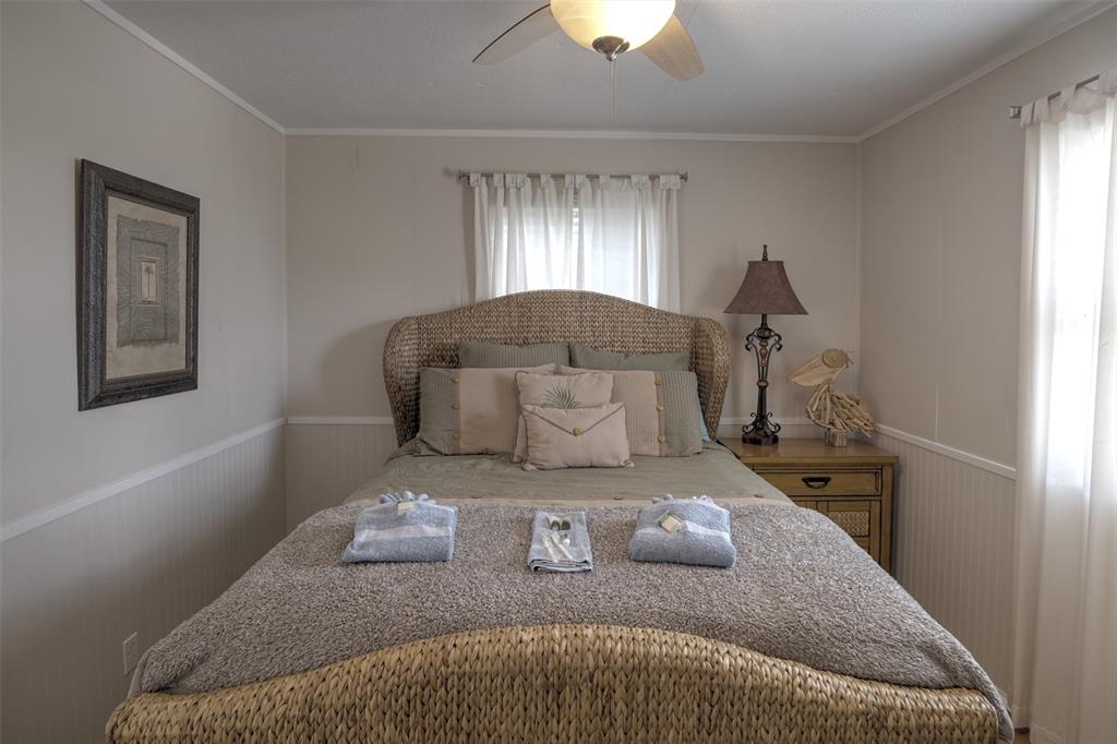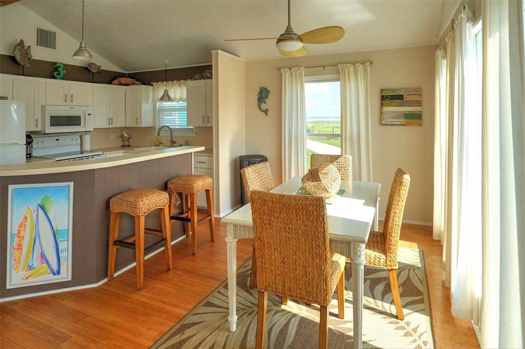 You will love this home. It is a popular rental, so please call ahead for showings. It is in a great location and is the perfect beach bungalow. This home sits looking to the east with views off the deck of the sunrise and stunning views of the bay. Access to the beach is a walking easement through the middle beachfront lots. The lots were angled when the subdivision. There is a small fenced area that you enter before going up the stairs. The large deck, many windows, and beach and bay views will all charm you and your guests. You enter off the deck into an open living/dining/kitchen area. There is a bar separating the kitchen and dining area. To the rear are the two bedrooms with the bath in between. It is open and relaxing. You will not want to leave. This home is adorable. Take time to schedule a showing soon.