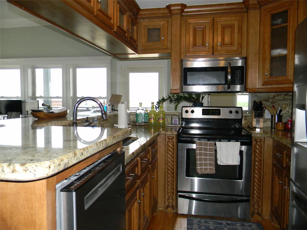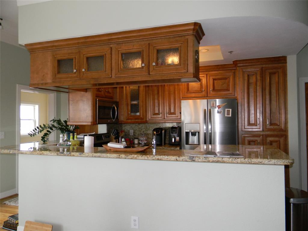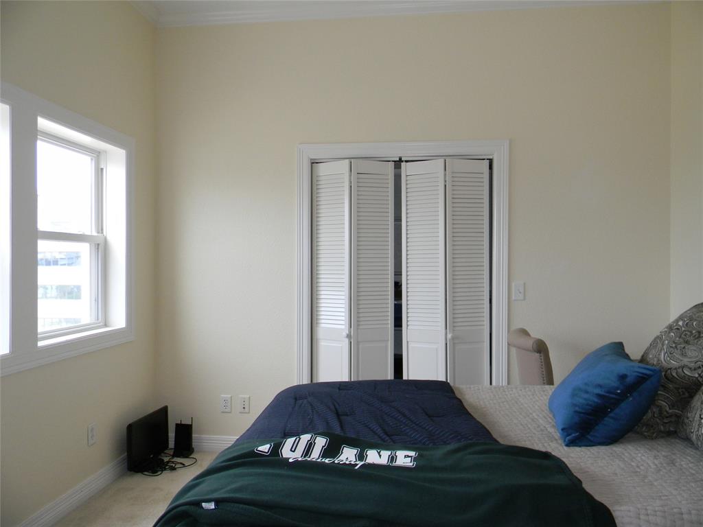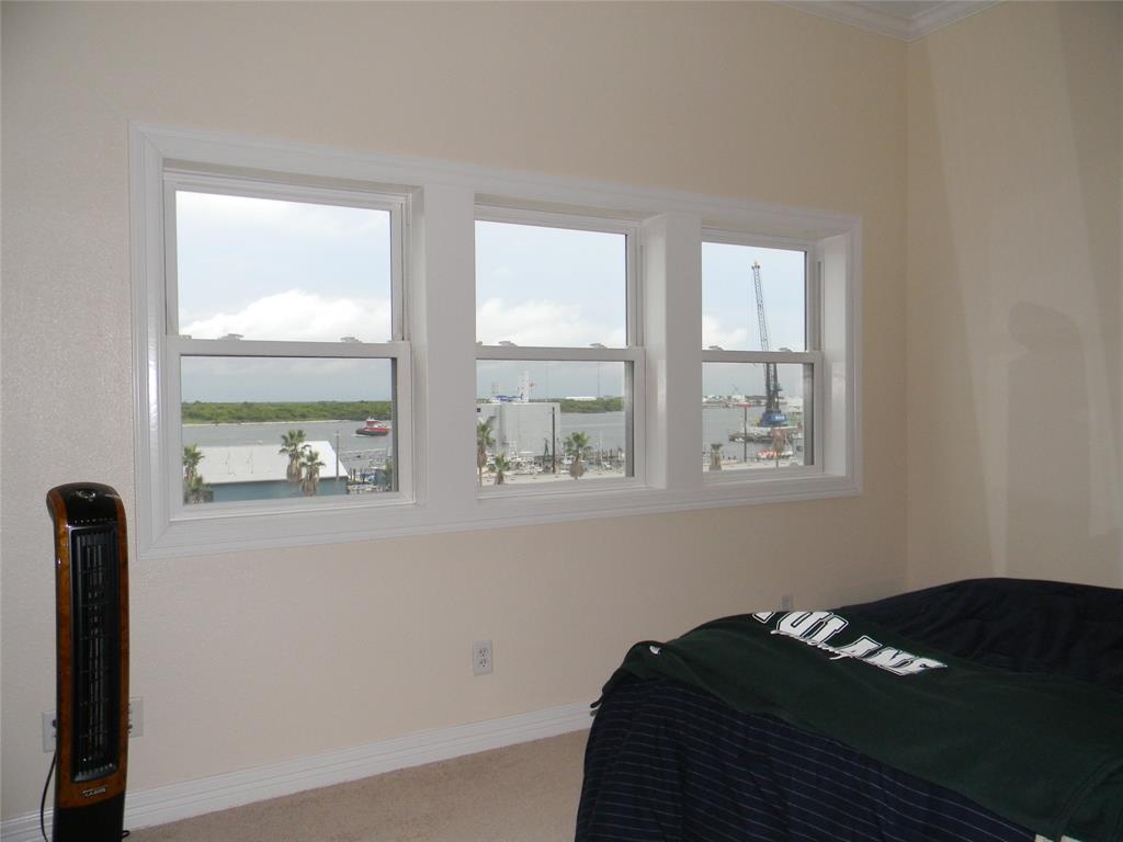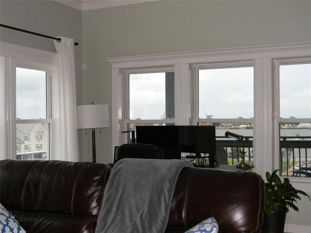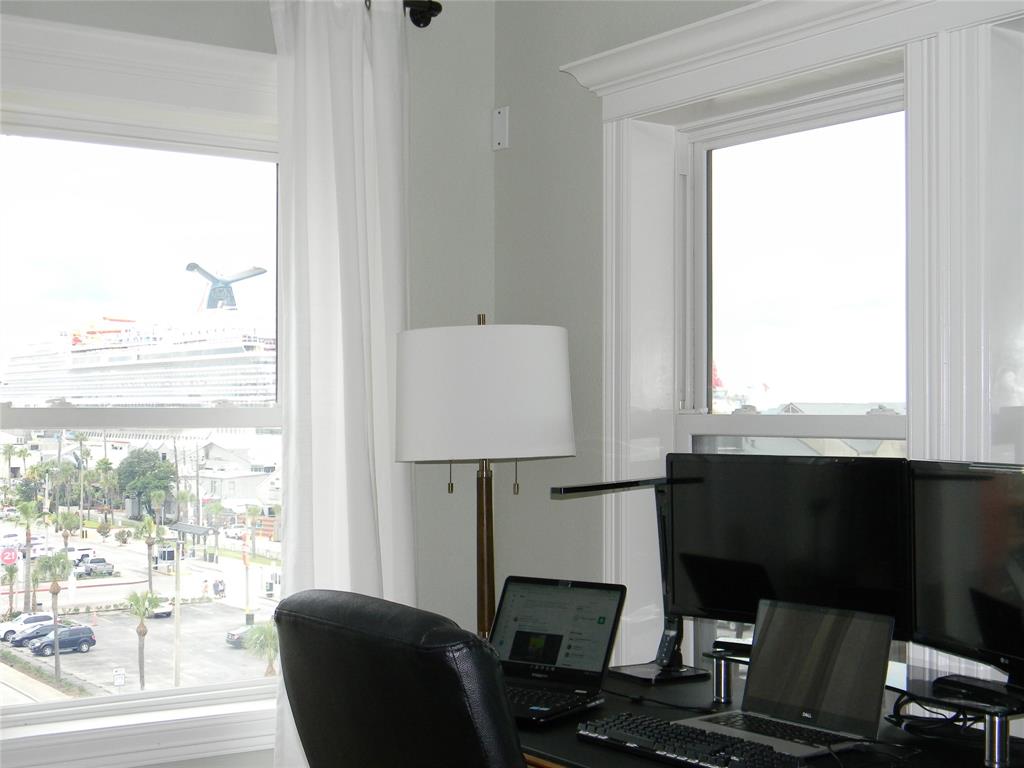 This delightful corner unit has views of the harbor and downtown that can be enjoyed from indoors or from the double sized covered deck. The oversized living space is flexible in furniture placement and can easily make a living area and dining area or a corner office with a view! Bar seating is available as well. Great downtown location-between the Strand and the Harbor. All local features such as dining, entertainment, shopping, museums, excursions are within short walking distance. One half block from the trolley system. Close to UTMB, fishing, restaurants. Assigned parking across the street. Available Sep 1, 2021.