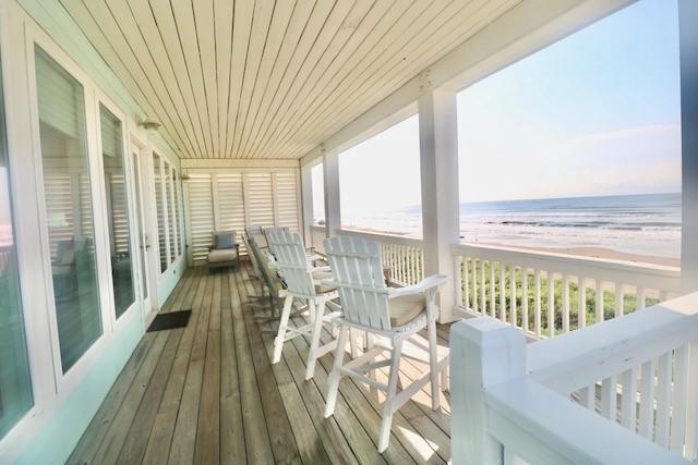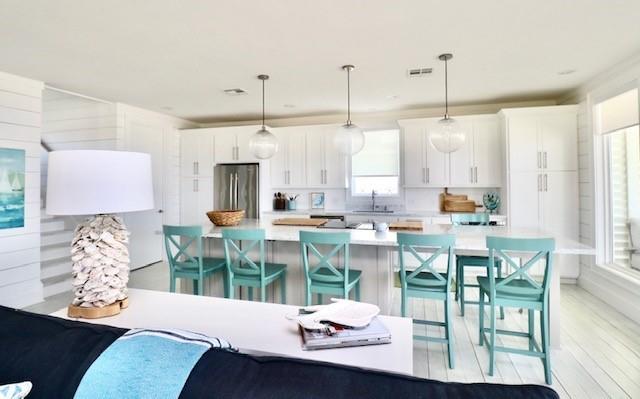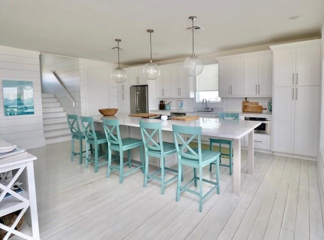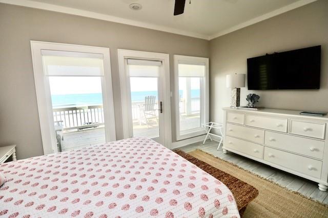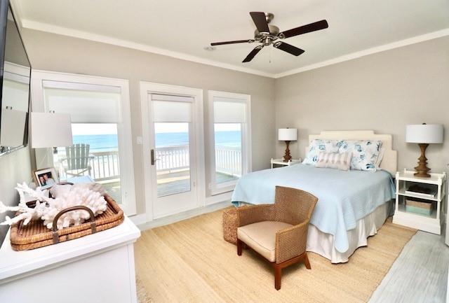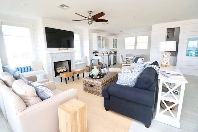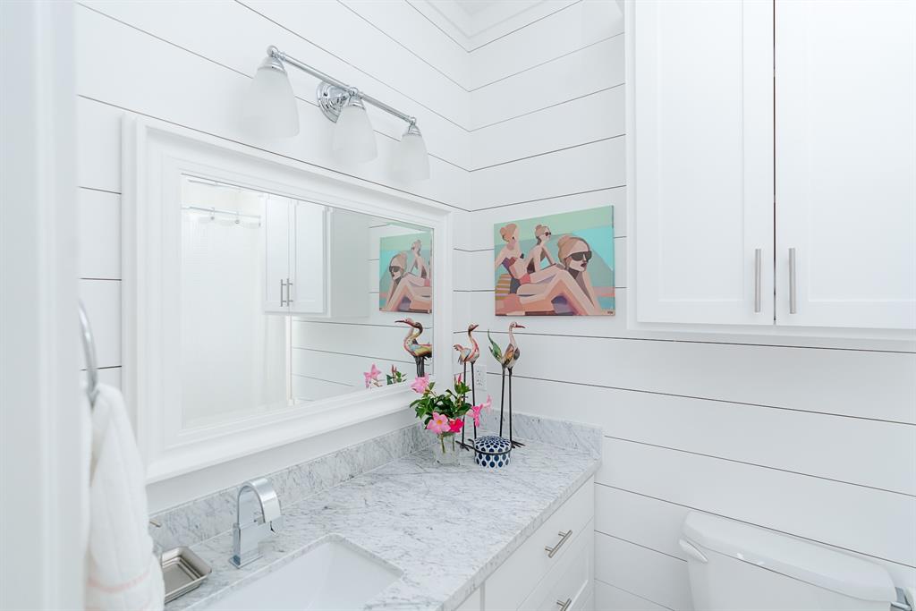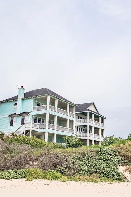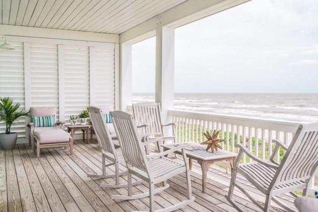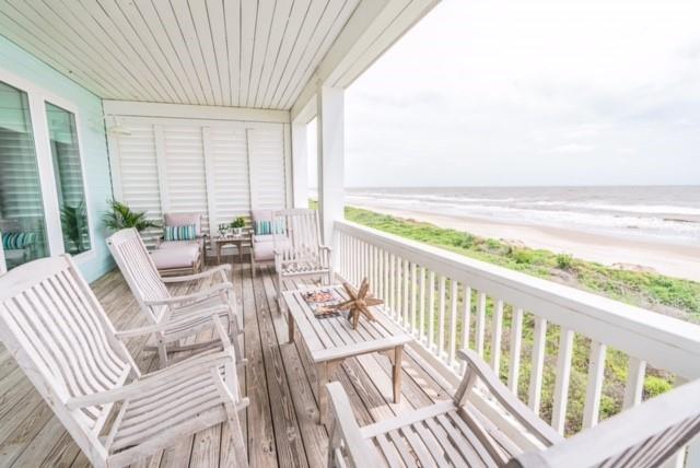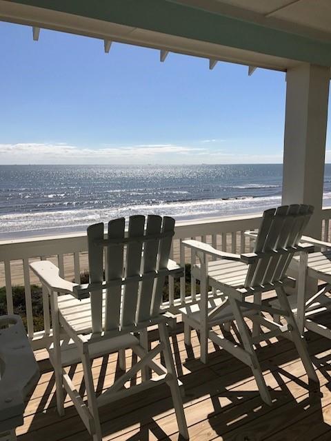 Steps away from the beach, this 2-story home boasts breathtaking views of the Gulf & Galveston. Living area features shiplap, coastal hues, window seats, fireplace, ample seating, a game table area, 12 ft bar w/built-in icemaker & wine fridge. Floor to ceiling windows bathe the LR & KIT in natural light, while the white washed pine floors add durability. The fully equipped kitchen has white cabinetry, a 13 ft island, marble counters & Jennair appl. The half bath & laundry room complete the main level. The upper level has 4 bedrooms. The two primary bedrooms each have an attached bath & private balcony. The 2 add’l guest rooms share the 3rd bath. Exterior features include a sand shower, grill, plenty of outdoor furniture & an 8x30 garage. House comes fully furnished, except for some accessories and personal items. See documents.