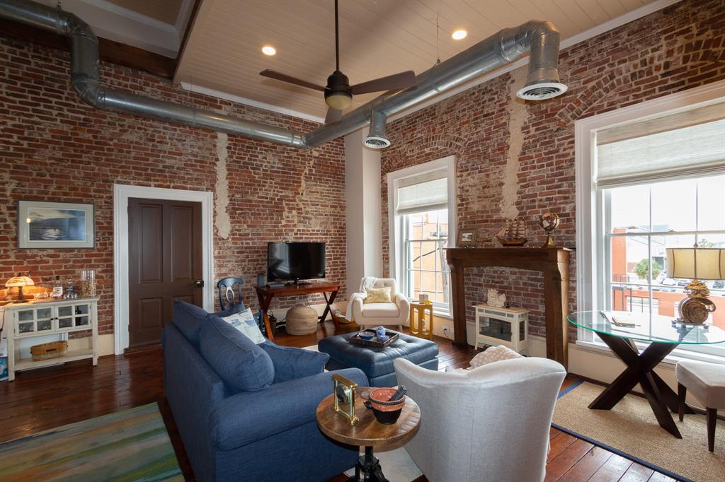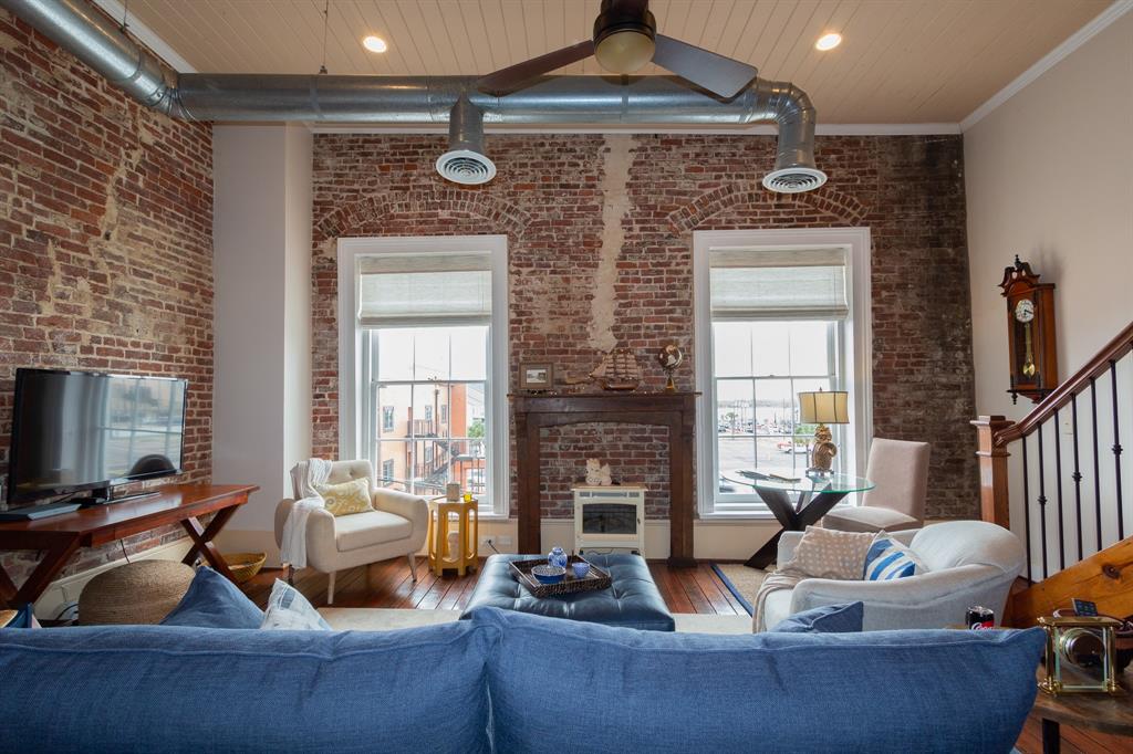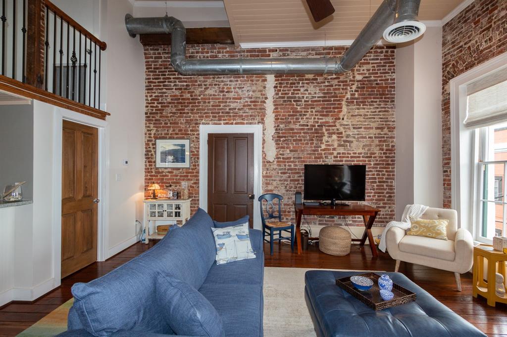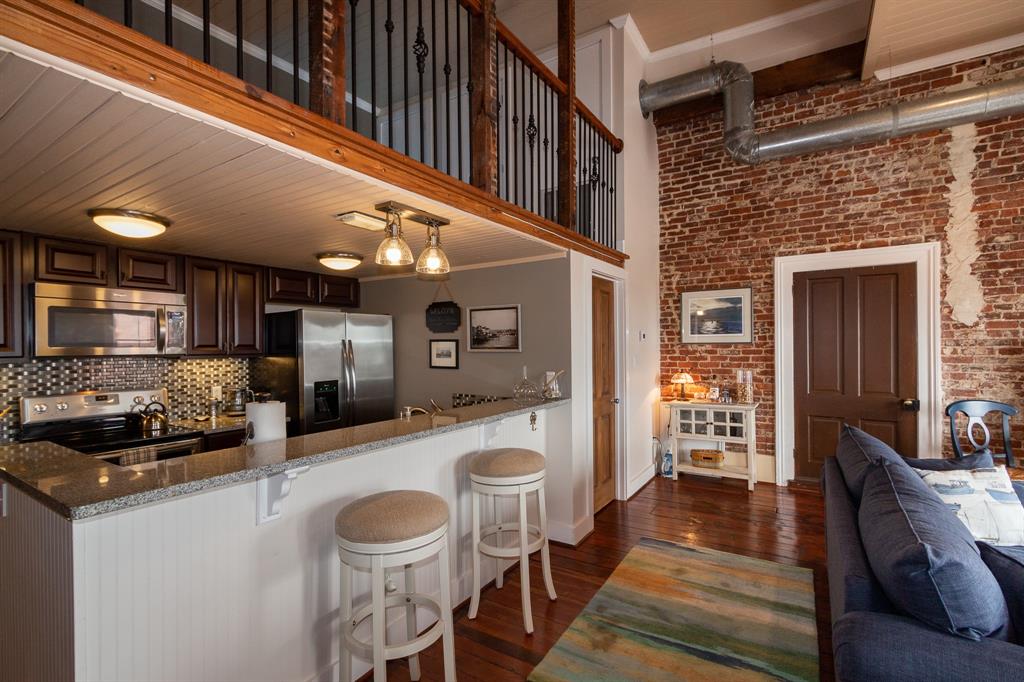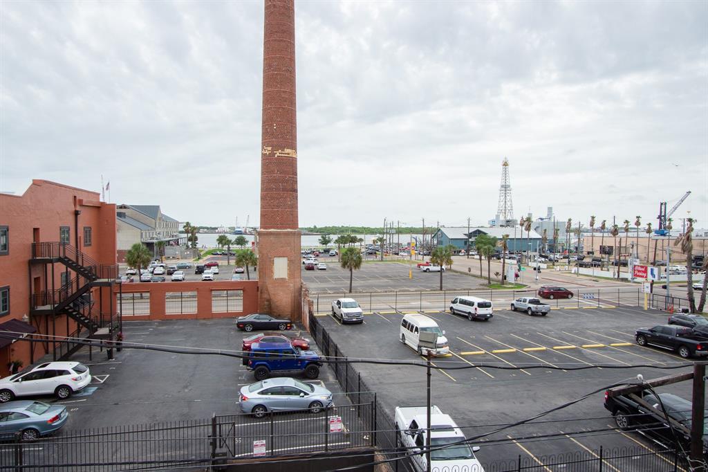 Live the true Galveston life on the 3rd floor of the Hendley Bldg., built in 1860 and converted to Lofts in 2014, with an elevator to all floors. This two bedroom condo has original brick walls, shiplap ceiling and NEW fully operational custom milled cypress wood sashes for the original historical windows to afford the maximum view of the harbor. Custom blinds accent these spectacular windows/views. The kitchen has a large double stainless sink with partial stainless and granite countertops. There is a wooden mantel in the unit that is said to be part of the original building; owner accented it with a mock fireplace. The AC was replaced in 2020. Some other rare attributes of this condo are a large storage room, both in the condo and on the ground floor, a washer and dryer and a designated parking spot by the rear entrance. Loft furniture included; other furniture negotiable. Within walking distance are all the Strand activities, as well as many restaurants and shops.