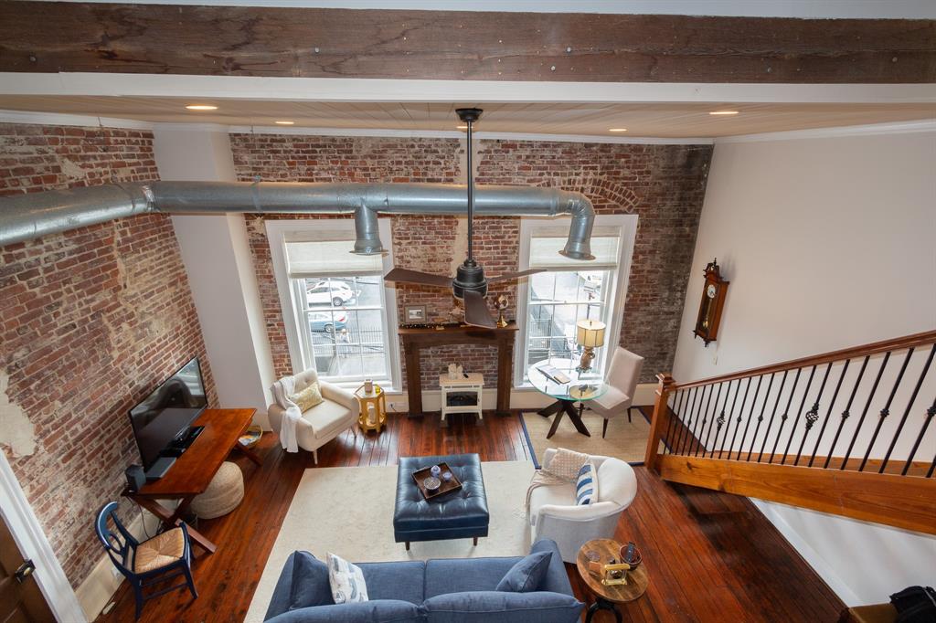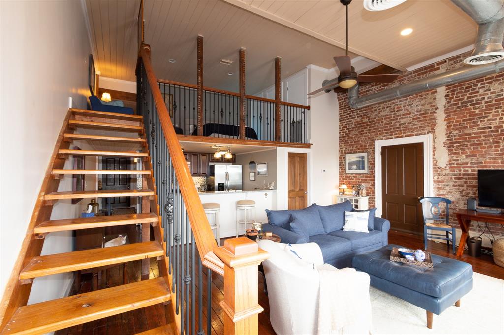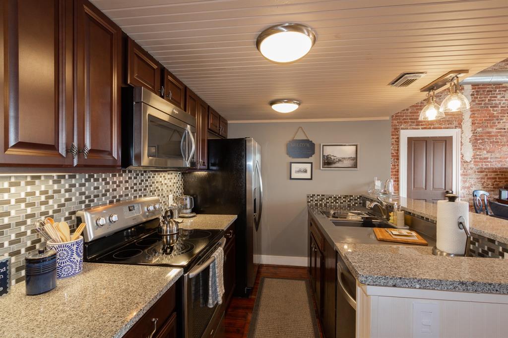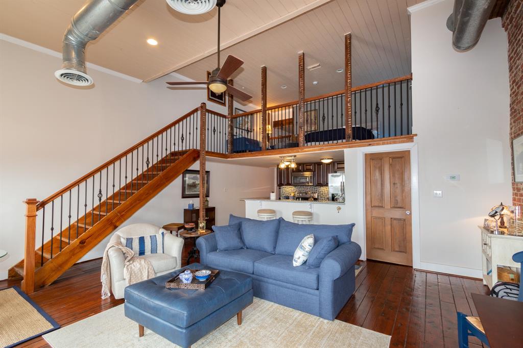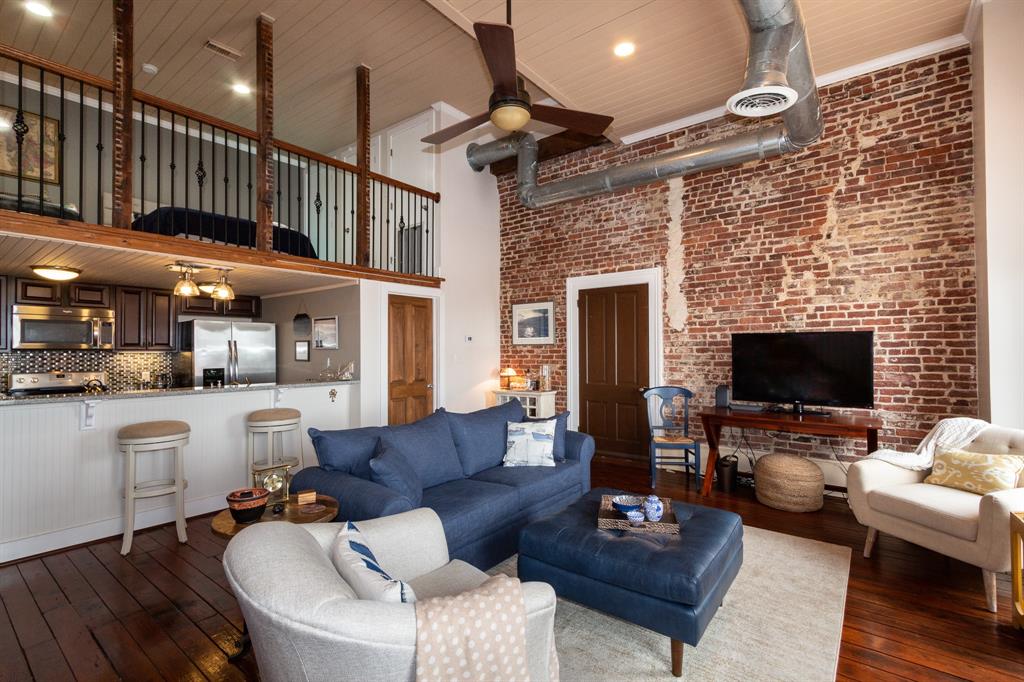 Live the true Galveston life on the 3rd floor of the Hendley Bldg., built in 1860 and converted to Lofts in 2014, with an elevator to all floors. This two bedroom condo has original brick walls, shiplap ceiling and NEW fully operational custom milled cypress wood sashes for the original historical windows to afford the maximum view of the harbor. Custom blinds accent these spectacular windows/views. The kitchen has a large double stainless sink with partial stainless and granite countertops. There is a wooden mantel in the unit that is said to be part of the original building; owner accented it with a mock fireplace. The AC was replaced in 2020. Some other rare attributes of this condo are a large storage room, both in the condo and on the ground floor, a washer and dryer and a designated parking spot by the rear entrance. Loft furniture included; other furniture negotiable. Within walking distance are all the Strand activities, as well as many restaurants and shops.