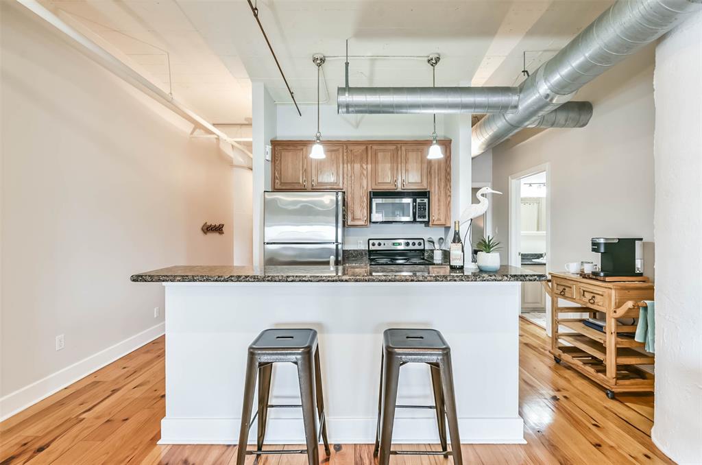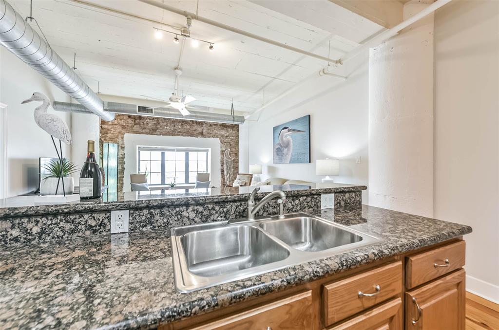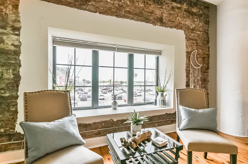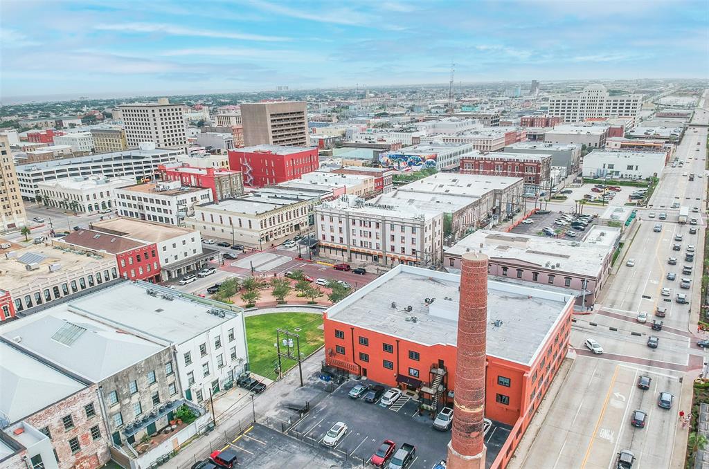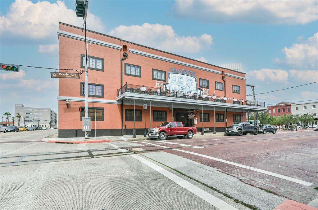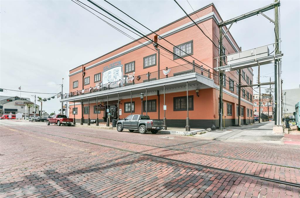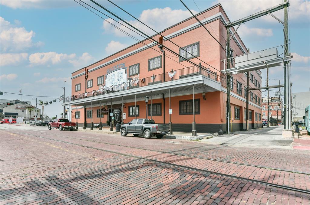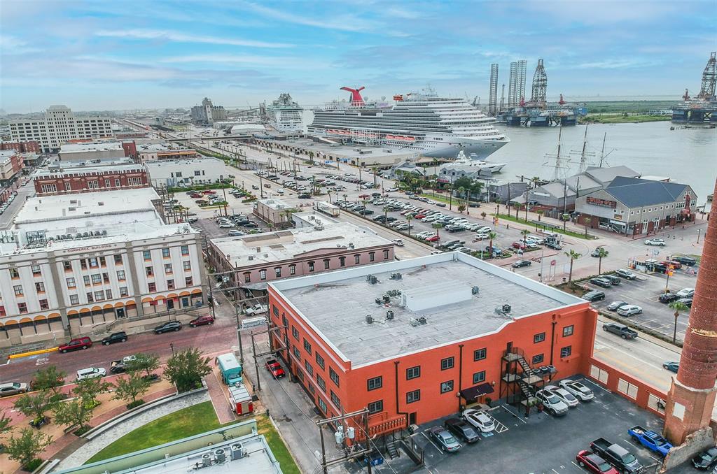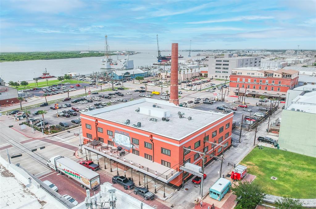 Nestled in the heart of Galveston's popular Strand District, you will find this gorgeous 2/2 in the historic Galveston Ice House building. Fall in love with the original exposed brick walls with windows overlooking Galveston's Harbor. Kitchen with ample storage, granite countertops, stainless appliances and breakfast bar. High ceilings with exposed duct work give a modern feel to this loft featuring open floor plan with amazing wood flooring throughout. Primary ensuite and living room offer water views where you can sit and watch ships come in and out of the harbor. If walking to your favorite restaurants and shopping are important to you, come and check this place out! On the main floor you will find your personal storage room where you can keep your bike and beach chairs. Parking is carefree too - unit comes with one assigned parking space inside a gated parking lot. Property conveys furnished with few exclusions. Short term rentals are not allowed!