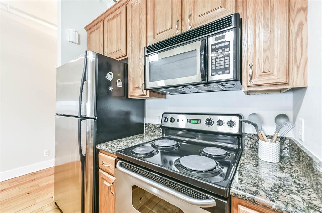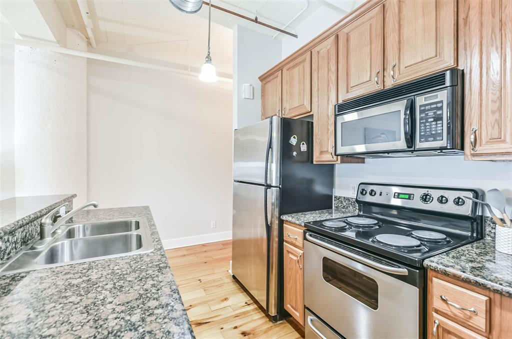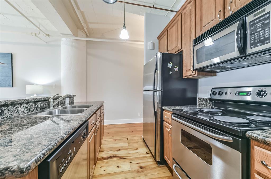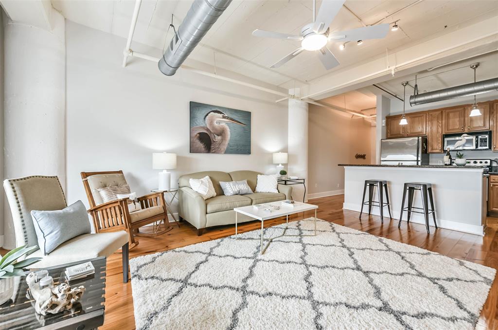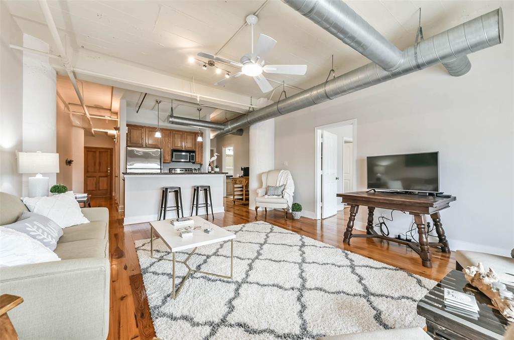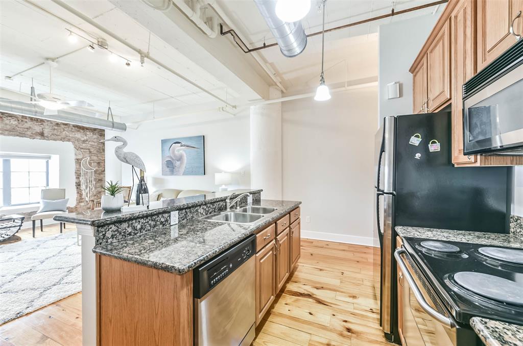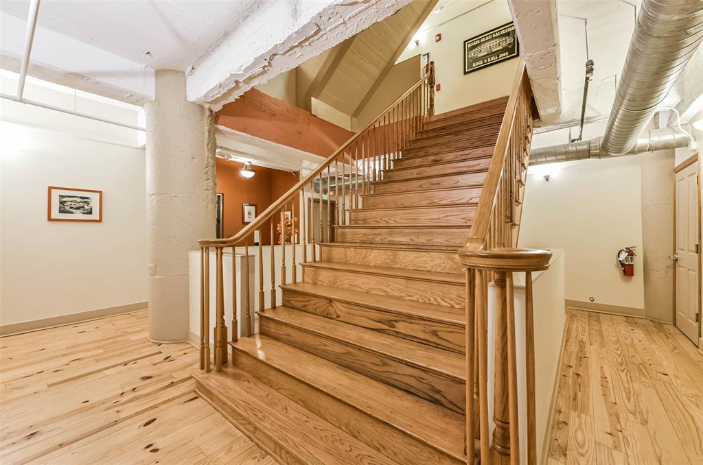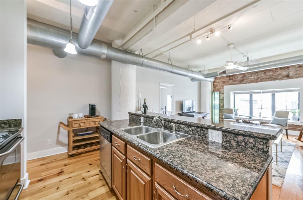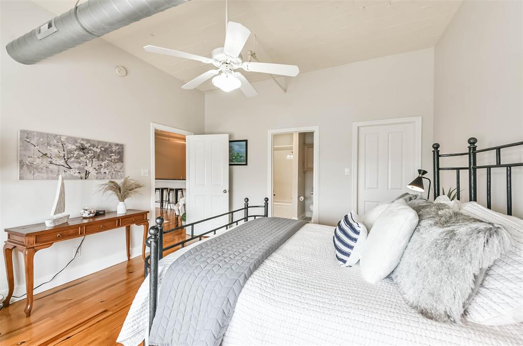 Nestled in the heart of Galveston's popular Strand District, you will find this gorgeous 2/2 in the historic Galveston Ice House building. Fall in love with the original exposed brick walls with windows overlooking Galveston's Harbor. Kitchen with ample storage, granite countertops, stainless appliances and breakfast bar. High ceilings with exposed duct work give a modern feel to this loft featuring open floor plan with amazing wood flooring throughout. Primary ensuite and living room offer water views where you can sit and watch ships come in and out of the harbor. If walking to your favorite restaurants and shopping are important to you, come and check this place out! On the main floor you will find your personal storage room where you can keep your bike and beach chairs. Parking is carefree too - unit comes with one assigned parking space inside a gated parking lot. Property conveys furnished with few exclusions. Short term rentals are not allowed!