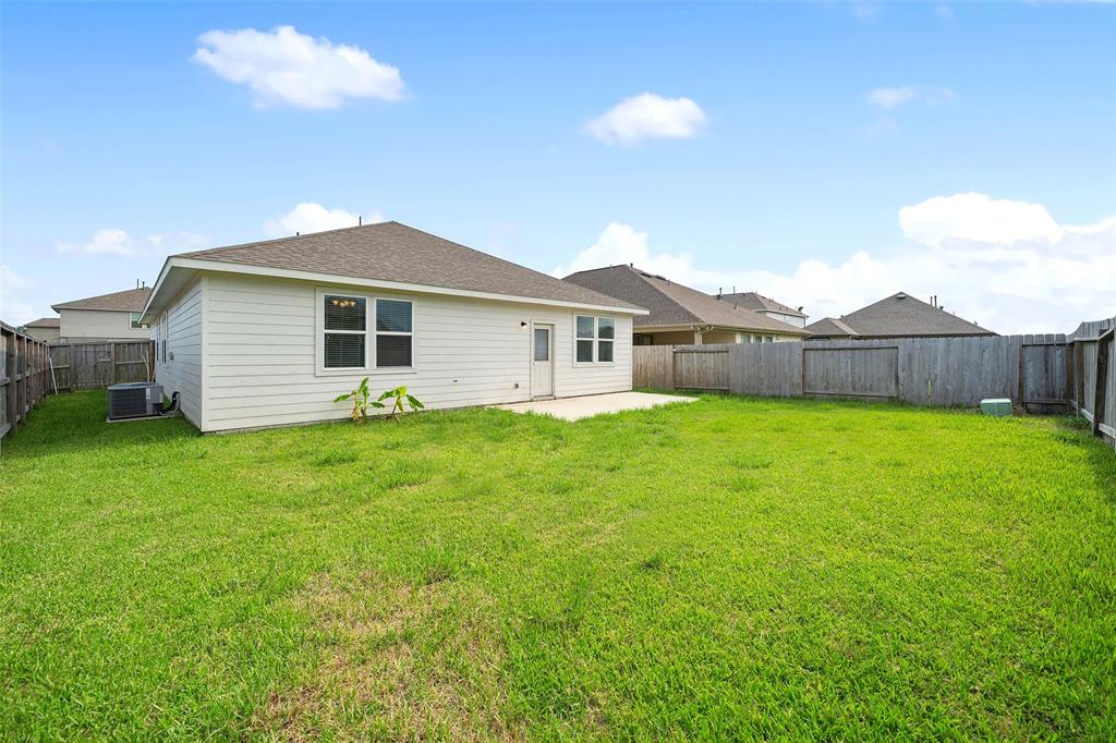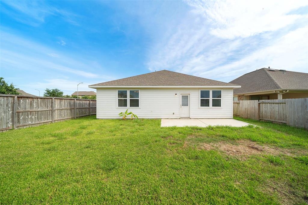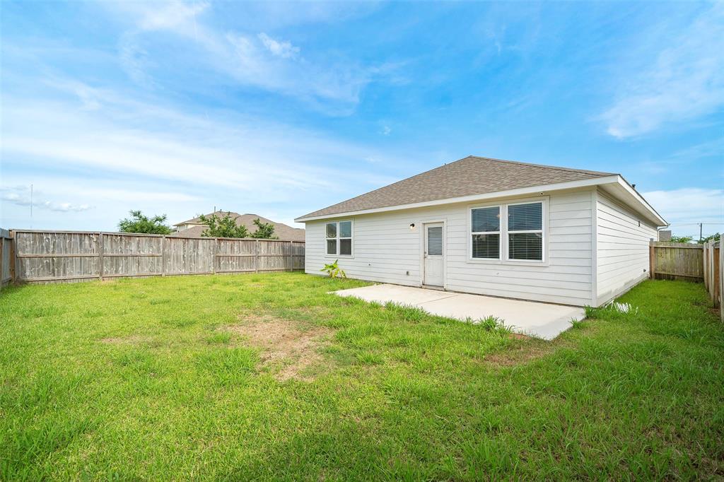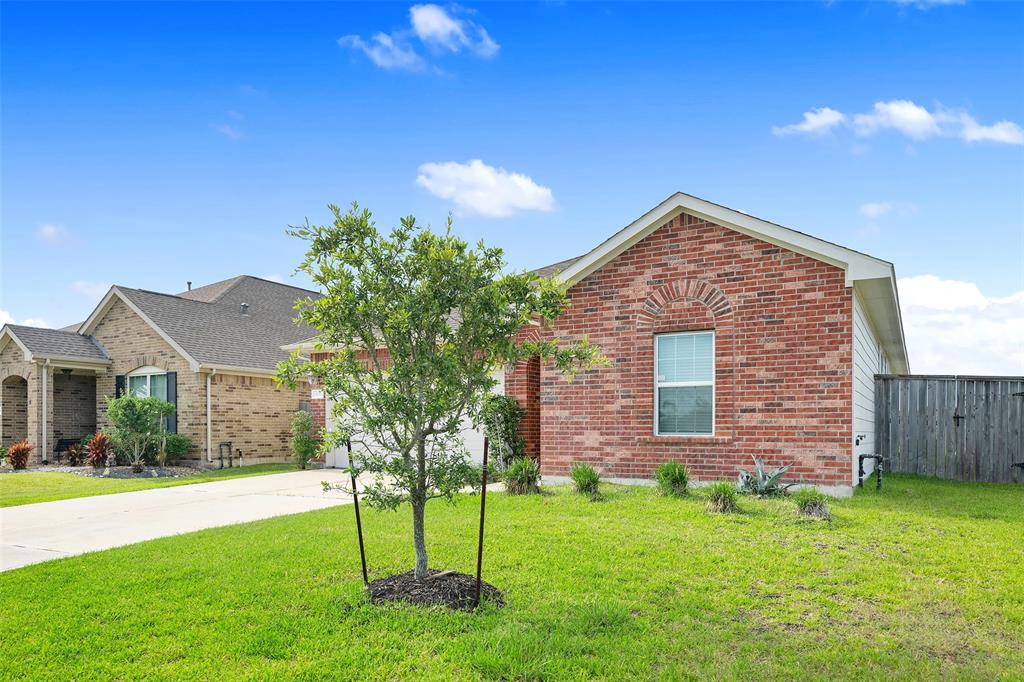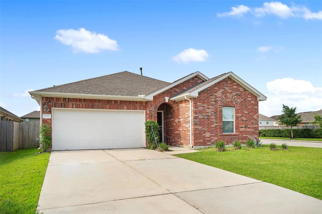 Lovely 3 bedroom, 2 bathroom, single-story home featuring a 2-car attached garage and a shaded front porch! Inside, you'll find a tile entry, crown molding, a formal dining, a spacious living room, and the island kitchen that includes granite countertops, a tile backsplash, recessed lighting, and access to the utility room while the primary bedroom suite is separate from the secondary bedrooms and has dual sinks, garden tub, separate shower, and dual walk-in closets. Enjoy the backyard space with an open patio as well as the location on a corner lot with proximity to I-45, Tanger Outlets, and Galveston Island!